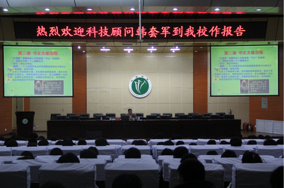 《国学》系列讲座第二讲为《守正方能出奇》。韩老师首先为同学们厘清什么是道德,诚信的重要性,韩局长强调有错不可怕,但是要从中得到教训,知错就改;要用正、智、信、廉来规范自己的品行;聪明有度,尽职尽责,便是职场赢着;要恪守信义,无论什么情况,都要做好自己应做的事。并鼓励同学们以身作则,让国学真正走进心中,造就完美人生。