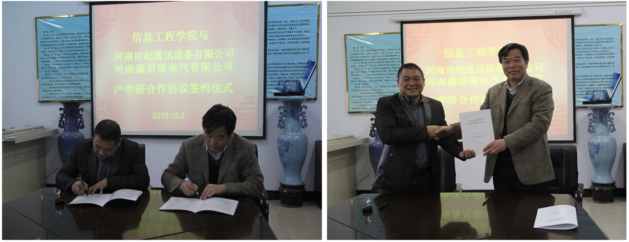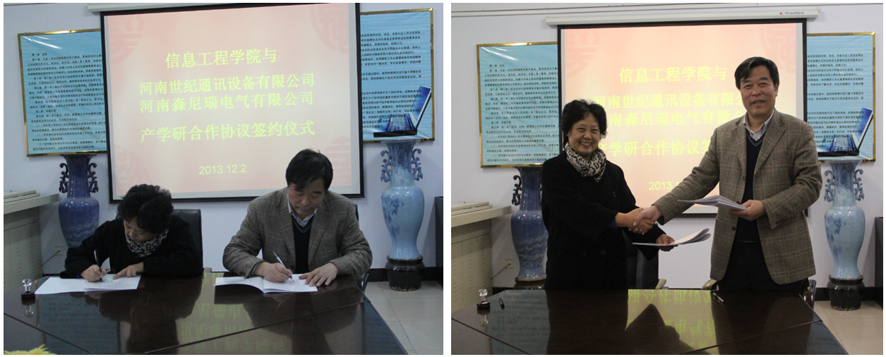 张志立院长代表学院分别与河南世纪通讯设备有限公司、河南森尼瑞电气有限公司在校企合作协议书上签字并交换协议书。