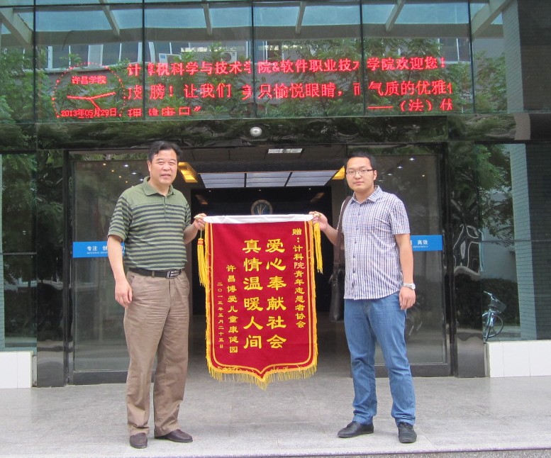 5月29日上午,许昌市博爱儿童康健园院长张辉为开云官网青年志愿者协会送来了一面锦旗,以感谢开云官网青年志愿者长期对博爱儿童康健园的义务服务活动。开云官网院长张志立代表学院接过了锦旗,并对张辉院长表示感谢,同时要求志愿者们再接再厉,继续发扬“奉献、友爱、互助、进步”的精神,努力做好作为一名志愿者的工作,为学院争光。