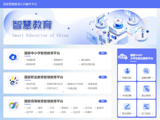 国家智慧教育平台是教育系统认真贯彻落实习近平总书记关于教育的重要论述、关于数字中国建设的重要指示批示,立足国家战略,回应时代需求,正式推出的国家平台,也是教育数字化战略行动取得的阶段性成果。国家智慧教育平台汇聚基础教育、职业教育、高等教育优质课程资源及大学生就业服务。其中国家职业教育智慧平台涵盖20个学科大类,国家级、省级、校级三个级别的专业资源库、在线精品课和视频公开课。入选资源具备质量高、共享范围广、应用效果好、示范作用强等特点,代表当前我国在线教育资源的高质量高水平。