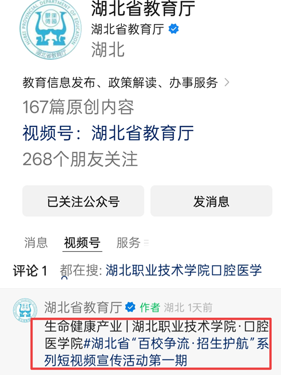 近日,william威廉英国官网精心制作的招生宣传视频登上湖北省教育厅视频公众号平台进行宣传。这一成果不仅是对学院办学实力的高度认可,更是学院在职业教育领域影响力持续提升的重要标志。