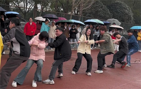 比赛期间,虽然雨水不断,但这并没有削减同学们的热情。无论是跃跃欲试的参赛者,还是观赛的同学们和加油的拉拉队,个个精神振奋,斗志昂扬。这场比赛不仅是一场力与力的较量,更是一次团队协作和精神风貌的展现。