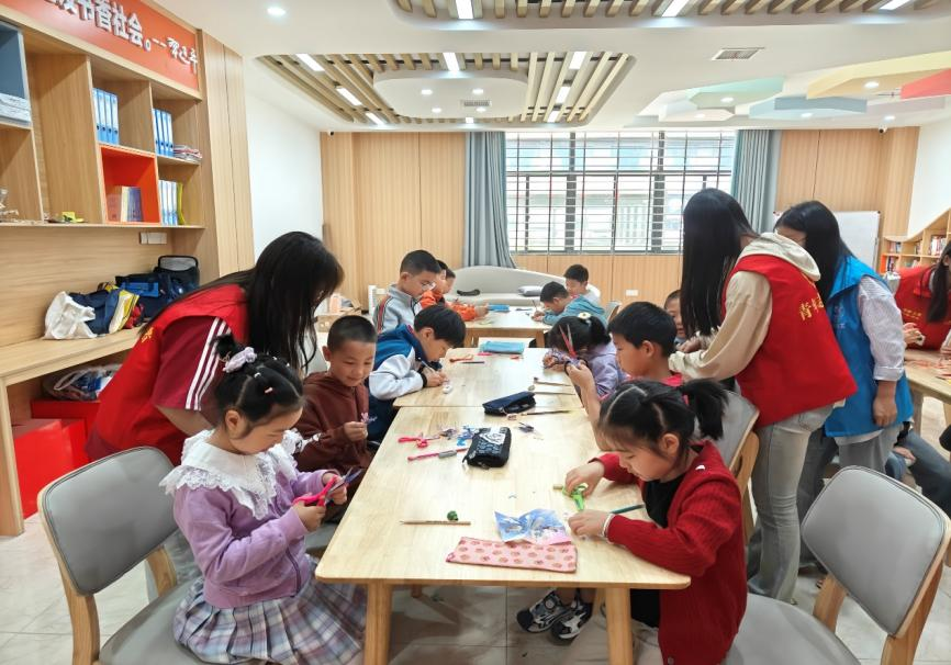 活动当天,仙女湖社区活动室内洋溢着欢声笑语。志愿者们早早布置好场地,整齐摆放好彩纸、剪刀等工具。孩子们怀着期待的心情围坐在一起,一双双清澈的眼睛满是对剪纸活动的好奇。志愿者们化身“剪纸小老师”,从折纸的技巧、图案的构思,到剪刀的安全使用,都进行了细致入微的讲解。