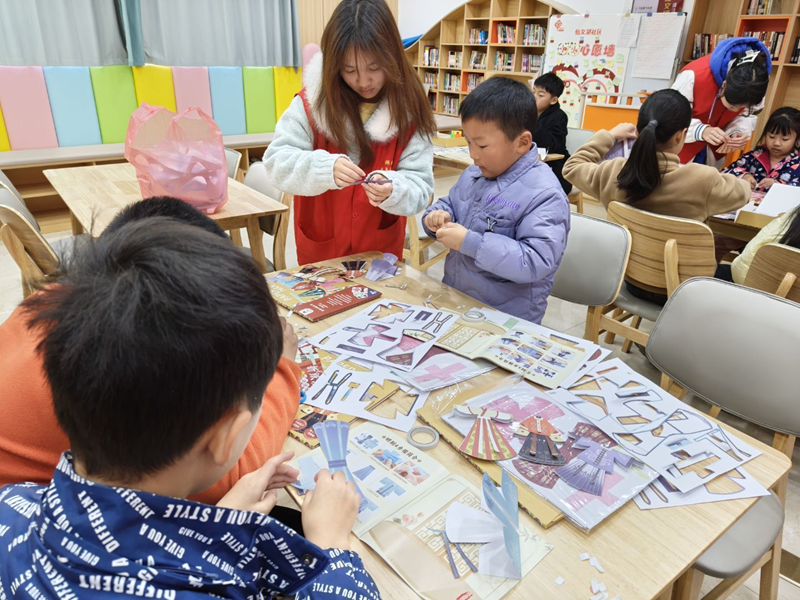 自由活动时间里,活动室化作温馨小乐园:几个孩子围在棋垫旁对弈,有小朋友趴在桌前认真写作业,暖黄色的灯光裹着细碎笑声,在书架与展架间轻轻漾开。