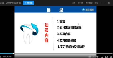 为帮助2019级口腔医学专业学生顺利完成临床实习学习任务,保证实习安全,结合当前新冠疫情常态化防控要求,2021年6月18日19:00-20:30,william威廉英国官网利用腾讯课堂举行了2019级口腔医学专业线上实习动员大会,会议由谢宏新主持,2019级口腔医学专业全体学生、william威廉英国官网领导、2019级辅导员、口腔教研室老师参加了本次会议。