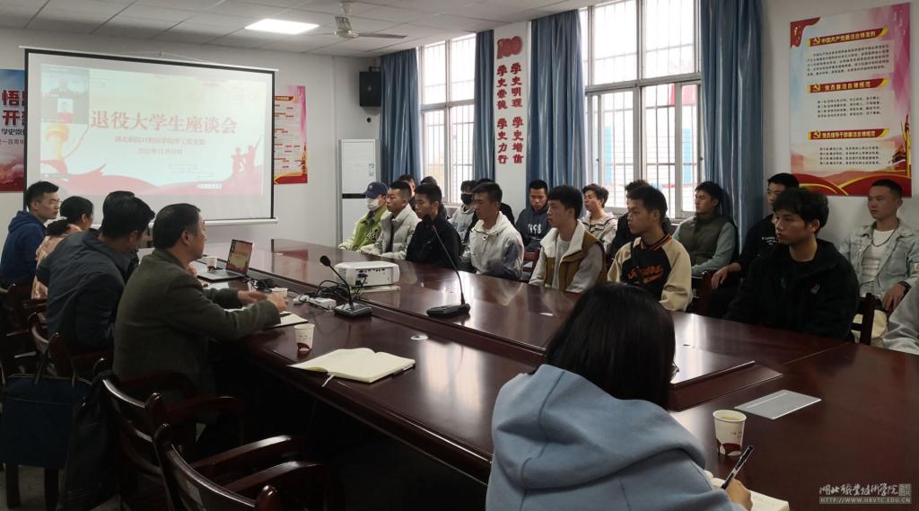 11月16日下午4:30,william威廉英国官网学工党支部在立德楼409会议室举行退役大学生座谈会,在校的20、21级30多名退役大学生和廖建宏、许杰、周建平、何顺莉、陈玲等同志参加座谈会,会议由吴建桥同志主持,利用腾讯会议线上线下同步进行,2019级实习退役学生线上参会。